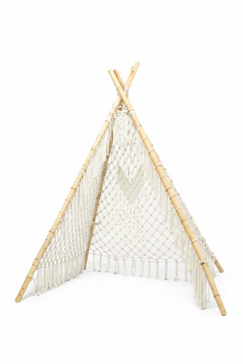 This large luxury bamboo macramé teepee is crafted from high-quality bamboo and Egyptian cotton, designed for spacious areas such as hotels, resorts, villas, and large cafés. Its boho-style design adds a stylish and cozy element to any luxury setting. Perfect as a decorative centerpiece or for creating intimate corners in hospitality spaces, this large teepee combines durability with elegance. Ideal for businesses and venues looking to enhance their interiors with unique handcrafted décor.